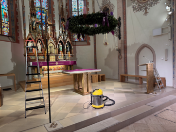 Die Altäre, die Kanzel, die beiden Beichtstühle, der Kreuzweg und Figuren wurden vom Staub und Spinnenweben befreit, die Bänke abgewaschen, die Glaswindfänge gereinigt, die Heizungs- und Lüftungsschächte wurde ausgesaugt und mit neuem Flies ausgelegt. Die Fußmatten in den Eingangsbereichen wurden abgesaugt und die Lampen im Mittelschiff und im Altarbereich wurden gereinigt. Die Schriftenständer wurden gereinigt und die Liedbücher sowie das Informationsmaterial wurde wieder in die Schriftenständer einsortiert. Die Empore und das Treppenhaus zur Empore wurden in dieser großen Putzaktion auch geputzt.